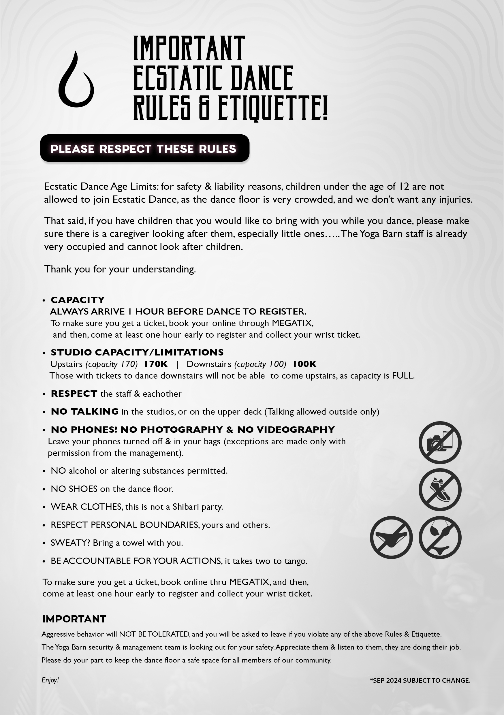 NO PHONES! NO PHOTOGRAPHY & NO VIDEOGRAPHY. Leave your phones turned off & in your bags (exceptions are made only with permission from the management).