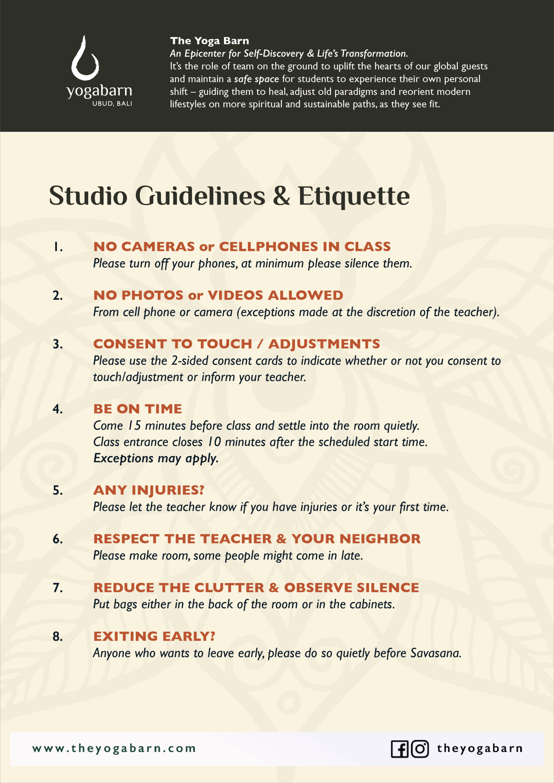 NOTE: If you use our mats and props, please leave them in place at the end of class so our team can collect and sanitize them. Please DO NOT return used mats or props to the cabinets.